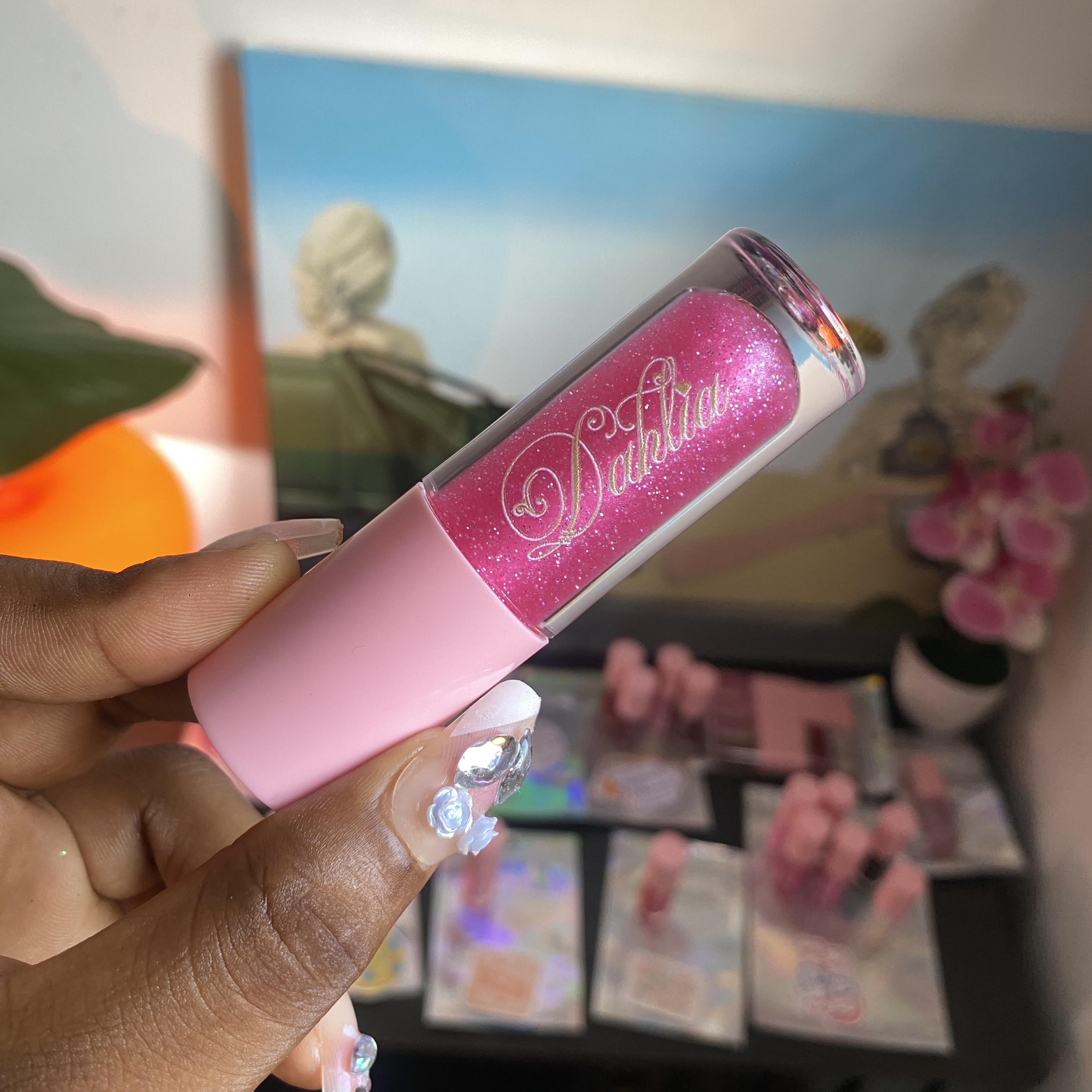 A clear shimmery pink gloss scented like flowers & berries💐🍓